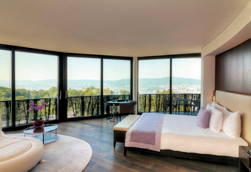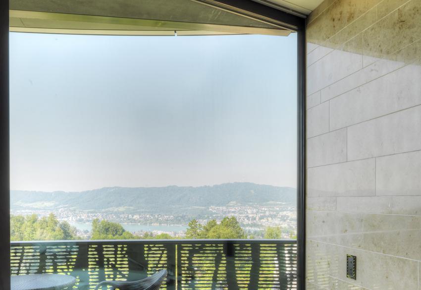 Из окон отрывается живописный вид на заросшие лесами Альпы и Цюрихское озеро.